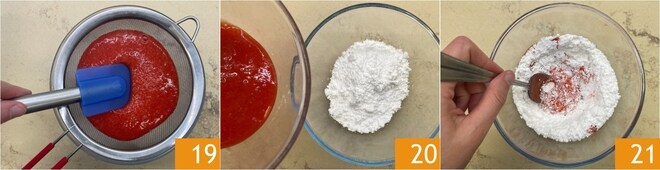 Peneire o purê com uma peneira para deixá-lo liso e homogêneo 19, depois adicione o açúcar de confeiteiro 20 e misture tudo 21.