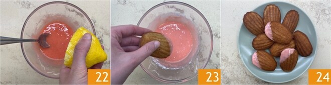 Por último, adicione o suco de limão 22 e mexa novamente. Mergulhe uma extremidade das madeleine na cobertura 23 e deixe secar em temperatura ambiente. Suas madeleine de morango estão prontas para serem servidas 24!