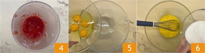 Depois de preparar o purê de morangos 4, derreta a manteiga em uma panela e deixe esfriar. Em uma tigela separada, coloque os ovos 5 e bata junto com o açúcar, sem montar 6.