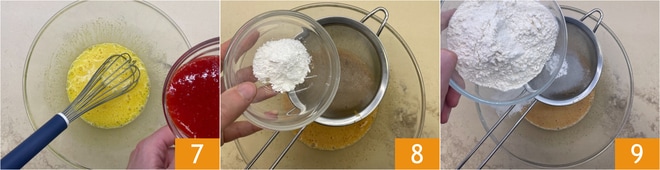 Adicione também o purê de morango 7 e misture a massa com um batedor. Peneire o fermento 8 e a farinha 9 na tigela.