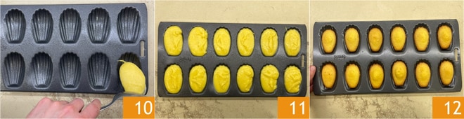 Após o tempo de descanso, unte uma forma de madeleines e preencha-a com a massa usando 2 colheres (alternativamente, você pode usar um saco de confeitar) 10. Não encha excessivamente as formas, pois a massa irá crescer durante o cozimento 11. Asse as madeleines em forno estático pré-aquecido a 180°C por 11-12 minutos. Assim que estiverem assadas, retire do forno e deixe esfriar completamente na forma 12.