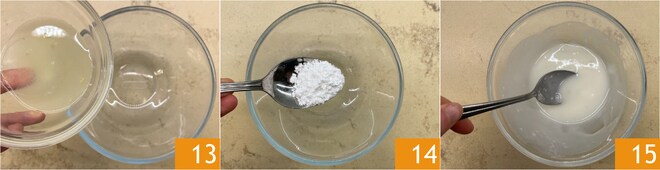 Enquanto as madeleines esfriam, você pode preparar a cobertura: despeje o suco de limão coado 13 e o açúcar de confeiteiro em uma tigelinha 14, depois misture até obter uma cobertura de densidade média 15. Ajuste a quantidade de limão de acordo com a consistência desejada da mistura.