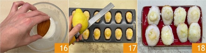 Neste ponto, mergulhe o lado liso das madeleines na cobertura 16 e coloque-as de volta na forma. Decore com a casca de limão ralada 17 e deixe secar. Suas madeleines glaceadas estão prontas para serem servidas 18!