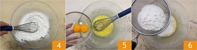 Misture com um batedor de mão 4, depois adicione os ovos, um de cada vez 5. Misture para incorporar, tomando cuidado para não incorporar ar. Peneire a farinha na tigela em 2 vezes 6 e incorpore-a com o batedor.
