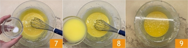 Adicione também uma pitada de sal 7. Por fim, despeje a manteiga derretida e esfriada 8 e misture rapidamente. Cubra com filme plástico e deixe a massa descansar na geladeira por cerca de uma hora e meia 9.