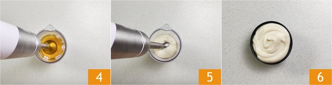 Neste ponto, mergulhe as lâminas do minipimer até o fundo do copo 4. Ligue então o liquidificador mantendo-o parado até que a maionese comece a montar 5. Neste ponto, mova o minipimer com movimentos de cima para baixo, até que o composto fique homogêneo e bem montado. Serão suficientes poucos segundos para essas etapas. Despeje a maionese pronta em um pote com tampa ou em uma tigelinha 6, cobrindo-a com filme plástico para evitar que se forme uma película na superfície. A maionese com liquidificador de imersão está pronta para uso!