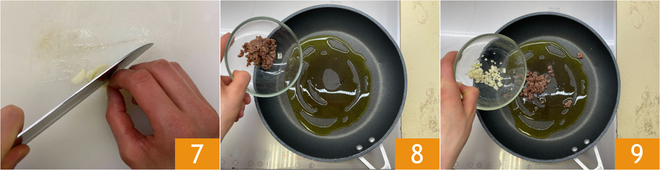 Pique o alho com uma faca 7. Despeje o óleo em uma panela, adicione os filetes de anchova 8 e o alho 9.