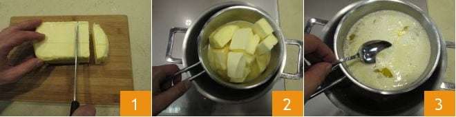 Para preparar a manteiga clarificada, a primeira coisa a fazer é cortar a manteiga em pedaços 1, em seguida, coloque-os em uma panela e derreta em banho-maria 2. Enquanto a manteiga derrete, você notará uma substância aquosa surgindo na superfície 3 deixe cozinhar em fogo baixo até que ela evapore completamente; deixe sem mexer.