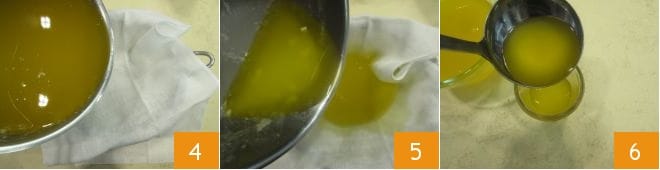 coloque um funil em um recipiente e forre-o com uma gaze esterilizada de malha bem apertada 4, despeje a manteiga clarificada líquida, tomando muito cuidado para que a caseína depositada no fundo não volte à superfície; por fim, coloque o líquido em potes. A manteiga clarificada se tornará sólida assim que esfriar.
