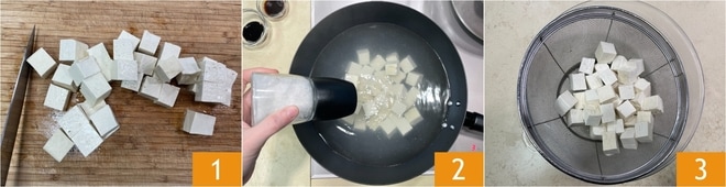 Para realizar o mapo tofu, primeiro corte o tofu em cubos, tomando muito cuidado para não desmanchá-los 1. Escalde os cubos de tofu em água levemente salgada por um minuto 2, depois escorra e reserve momentaneamente 3.