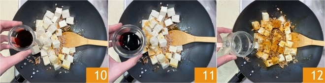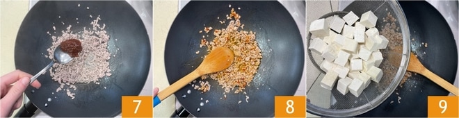 Tempere com o molho picante 7 e a pimenta. Misture bem para incorporar 8, depois adicione o tofu 9.