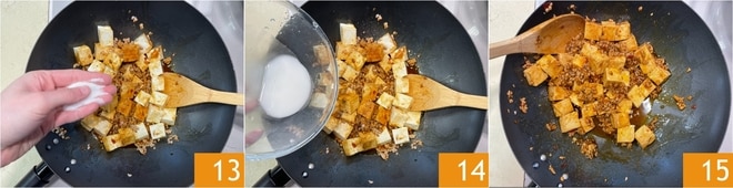 Adicione também o açúcar 13 e salteie por alguns minutos. Enquanto isso, dilua o amido de batata com uma colher de água e despeje no wok 14. Misture bem e desligue o fogo 15.