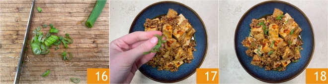 Corte em rodelas a parte verde da cebolinha 16 e use para decorar o prato 17. Seu mapo tofu está pronto para ser saboreado 18!