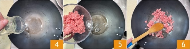 Aqueça um fio de óleo de sementes no wok 4, depois adicione a carne moída 5 e doure por alguns minutos, mexendo frequentemente 6.
