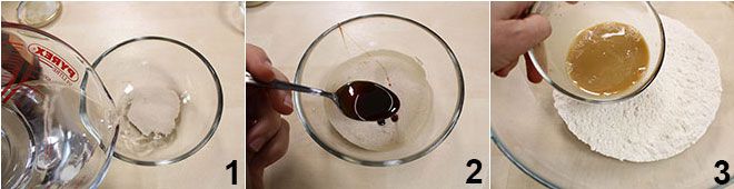 Para preparar os maritozzis, dissolva o fermento desidratado (ou 12 gr de fermento biológico fresco) em um pouco de água morna 1, adicione uma colher de chá de malte 2 e misture bem. Coloque a farinha manitoba em uma tigela, junto com o açúcar, formando um buraco no centro onde você irá derramar o fermento e o malte dissolvidos juntos 3, que você irá misturar um pouco com a farinha.