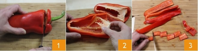 Para preparar a geleia de pimentas picantes, comece pelos pimentões: lave-os, seque-os e corte a parte superior 1, depois corte-os ao meio no sentido do comprimento e retire os filamentos brancos internos e as sementes 2. Finalmente, corte-os em pedaços 3.