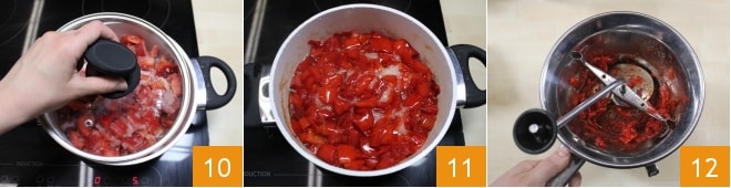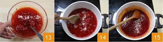 Quando terminar de passar as pimentas pela peneira, obterá uma polpa homogênea 13. Neste ponto, coloque novamente a mistura em fogo baixo e cozinhe, mexendo frequentemente 14 e retirando a espuma, se necessário, para eliminar a camada branca que pode se formar na superfície durante o cozimento. Cozinhe por 30 minutos, até que a geleia tenha se tornado densa 15.