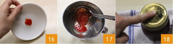 Após 30 minutos, faça o teste do pires: retire um pouco da mistura com uma colher de chá e deixe cair uma gota em um prato, que deve permanecer compacta 16, esta é a prova de que sua geleia está pronta. Se a gota escorregar e não ficar compacta, continue o cozimento pelo tempo necessário, mexendo frequentemente. Desligue o fogo e transfira a geleia quente para os potes previamente sanitizados: use uma concha e um funil para geleias 17. Encha os potes deixando 1 centímetro da borda, depois feche bem as tampas, mas sem apertar excessivamente. Deixe esfriar: com o calor da geleia, criará-se o vácuo, que permitirá conservar o produto por um longo tempo. Uma vez que os potes estiverem frios, verifique se o vácuo está correto: pressione o centro da tampa e, se não ouvir o clássico "click-clack", o vácuo foi criado 18. Sua geleia de pimentas picantes está pronta para ser degustada!