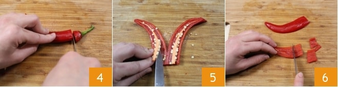 Neste ponto, coloque um par de luvas e proceda da mesma forma com as pimentas: lave-as, retire o cabinho 4, corte-as ao meio no sentido do comprimento e retire as sementes 5, por fim, corte as pimentas em pedaços 6.