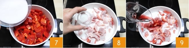 Coloque os pedaços de pimentões e pimentas em uma panela grande e adicione o açúcar refinado 7, o sal 8 e o vinho 9 e cozinhe em fogo bem baixo.