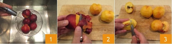 Para preparar a geleia de pêssego, comece escolhendo as frutas: pegue pêssegos bem maduros e de polpa firme, lave-os em água corrente 1, descasque-os 2 e retire o caroço 3.