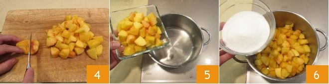 Corte-os em cubos grandes de cerca de 2 cm 4, coloque-os em uma panela 5 e adicione o açúcar 6.