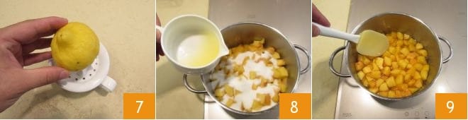 Se você não tiver um lugar fresco para deixar a fruta macerar com o açúcar, faça a mesma operação em uma bacia bem grande e coloque na geladeira coberta com filme plástico. Você pode saborear a geleia de pêssego em fatias de pão fresco ou usá-la para decorar e rechear seus doces!