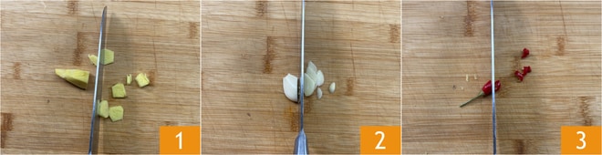 Para preparar o masala de grão-de-bico, primeiro prepare os ingredientes: descasque o gengibre e corte em fatias 2, depois faça o mesmo com o dente de alho 2. Pique a pimenta 3.