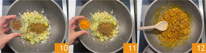 Adicione também o cominho 10 e a cúrcuma 11, depois misture 12. Deixe cozinhar por cerca de 8 minutos em fogo médio-baixo.