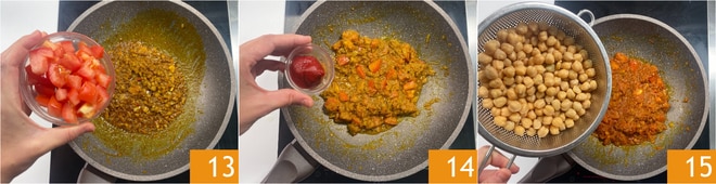 Quando a cebola estiver amolecida, adicione o tomate 13 e o extrato de tomate 14. Após 2-3 minutos, adicione os grãos-de-bico, que você já terá escorrido e enxaguado previamente 15.