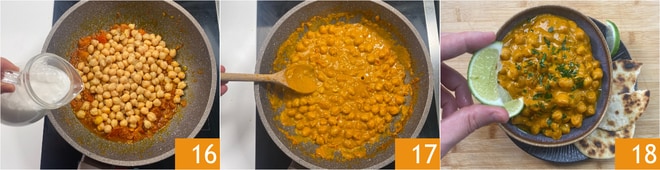 Adicione o leite de coco 16, depois salgue e mexa bem. Cozinhe por cerca de 25 minutos, sempre em fogo médio-baixo 17. Sirva seu masala de grão-de-bico decorado com coentro e um toque de limão 18!