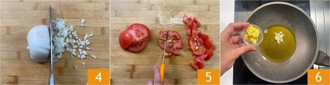 Limpe e pique finamente a cebola 4, depois corte o tomate em cubos 5. Aqueça um fio de óleo em um wok ou em uma panela antiaderente, depois adicione o alho e o gengibre 6.