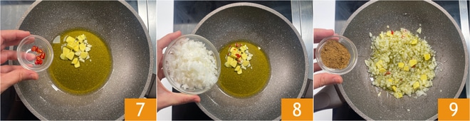 Adicione também a pimenta 7 e a cebola 8. Após alguns instantes, tempere com o masala 9.