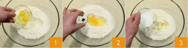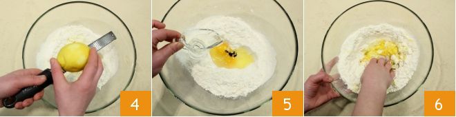 Para preparar as máscaras de Carnaval, comece pela massa: em uma tigela, peneire a farinha e adicione os ovos 1, depois acrescente as sementes de uma fava de baunilha (você pode extrair fazendo um corte na fava no sentido do comprimento) 2; adicione também a manteiga em pedaços, uma pitada de sal e o açúcar 3.