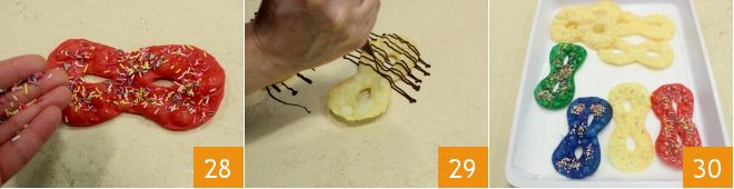 e decorá-las com confeitos coloridos 28. Você pode também pincelar com mel as brancas ou decorá-las com chocolate amargo derretido em banho-maria e colocado em um saco de confeitar 29 ou, ainda, polvilhar com açúcar de confeiteiro. Suas máscaras de Carnaval estão prontas para serem devoradas 30.