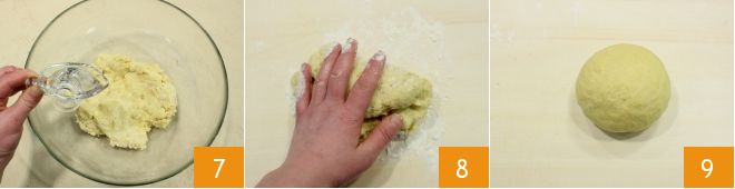 Quando a massa estiver mais homogênea, adicione a dose de água aos poucos 7, então amasse e depois transfira a mistura para uma superfície levemente enfarinhada para trabalhá-la 8. Forme uma bola 9.