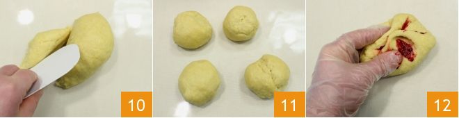 Com uma espátula 10, divida a massa em 4 bolinhas de 150 g cada 11: deixe uma bolinha branca, enquanto as outras devem ser coloridas com corantes alimentares líquidos: uma de vermelho 12