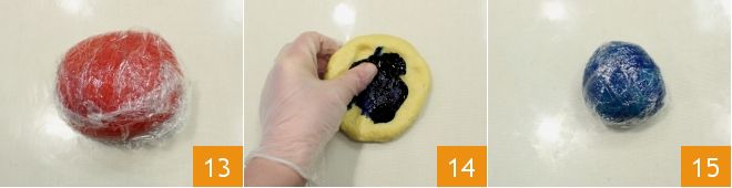 Embrulhe a massa colorida em filme plástico 13, depois pinte outra bolinha de verde e uma de azul (14-15).