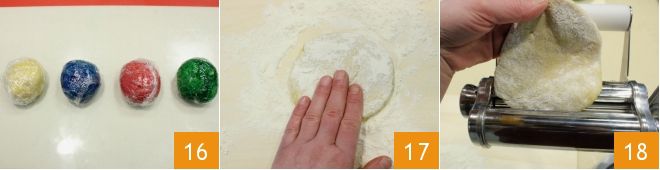 Agora que todas as massas estão prontas 16, deixe-as descansar em um local fresco por pelo menos 30 minutos. Passado o tempo necessário, você pode formar as máscaras: estenda a massa branca com um pouco de farinha 17 e passe-a na máquina de abrir massa 18;