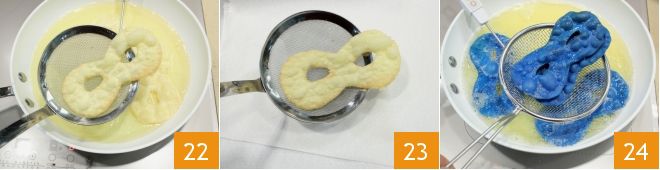 Frite as máscaras em bastante óleo de sementes por 1 minuto de cada lado (certifique-se de que o óleo não ultrapasse a temperatura de 170°) 22, depois escorra sobre papel absorvente 23. Em seguida, proceda da mesma forma com a massa azul: passe a massa na máquina, abrindo-a até ficar fina de 1 mm e 1/2, depois faça as máscaras e frite em bastante óleo de sementes, então escorra 24
