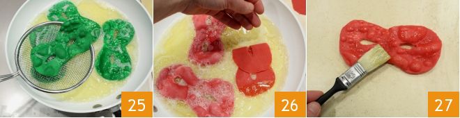 Faça e cozinhe também as máscaras verdes 25 e vermelhas 26. Uma vez escorridas e resfriadas, você pode pincelar com mel as máscaras coloridas 27