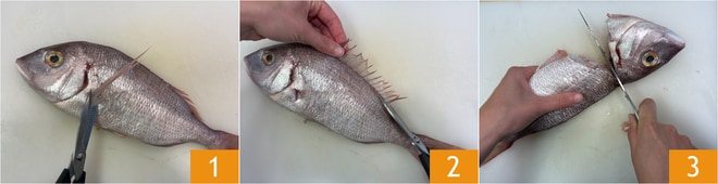 Para preparar a massa ao ragù branco de peixe, comece a limpar e filetar o pargo: primeiro faça um corte na barriga para eviscerar. Depois, corte as barbatanas 1 2 e retire a cabeça 3.