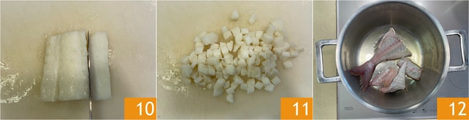 Corte o bacalhau na mesma dimensão 10 11. Coloque as espinhas e os resíduos do pargo em uma panela 12.