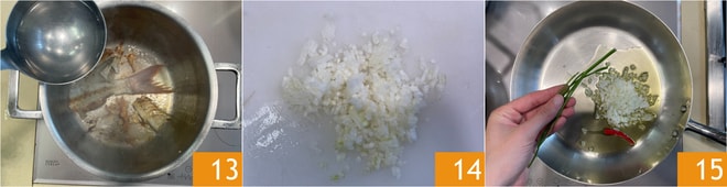 Toque bem os resíduos, depois cubra com 2 conchas de água, sal e leve à fervura 13. Limpe e pique a cebola 14. Em uma frigideira, coloque o óleo, a cebola, os ramos de salsa e a pimenta 15. Deixe a cebola dourar.