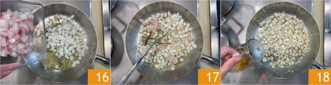 Adicione os pedaços de peixe 16 e deixe dourar por alguns minutos, depois retire a pimenta e os ramos de salsa 17. Flambe com o conhaque 18.