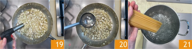 Flambe com um maçarico 19 ou com o fogo do fogão. Sal e adicione uma concha de água 20, cozinhe por mais 2 minutos. Cozinhe os espaguetones 21.