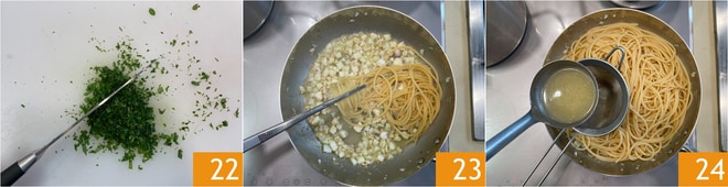 Enquanto a massa cozinha, pique as folhas de salsa, o tomilho e a manjerona 22. Escorra o espaguete, deixando um pouco firme, e adicione à panela com o peixe 23. Adicione o caldo de peixe coado 24 e, se necessário, a água de cozimento.