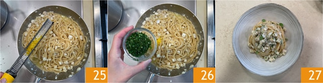 Finalize a massa com o fogo desligado, misturando com óleo, casca de limão 25, ervas picadas 26 e pimenta. Sirva a massa ao ragù branco de peixe e decore com manjerona fresca 27.