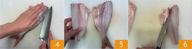 Corte o peixe ao meio 4 para obter os filés 5, retire também a parte da barriga 6. Não descarte os resíduos da limpeza porque serão usados mais tarde para fazer um caldo de peixe.