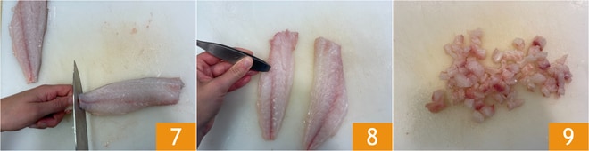 Depois de obter os dois filés, retire a pele passando a lâmina da faca desde o rabo, mantendo a pele esticada 7. Agora retire as espinhas com a pinça adequada 8. Corte o pargo em cubos de cerca de 2 cm 9.